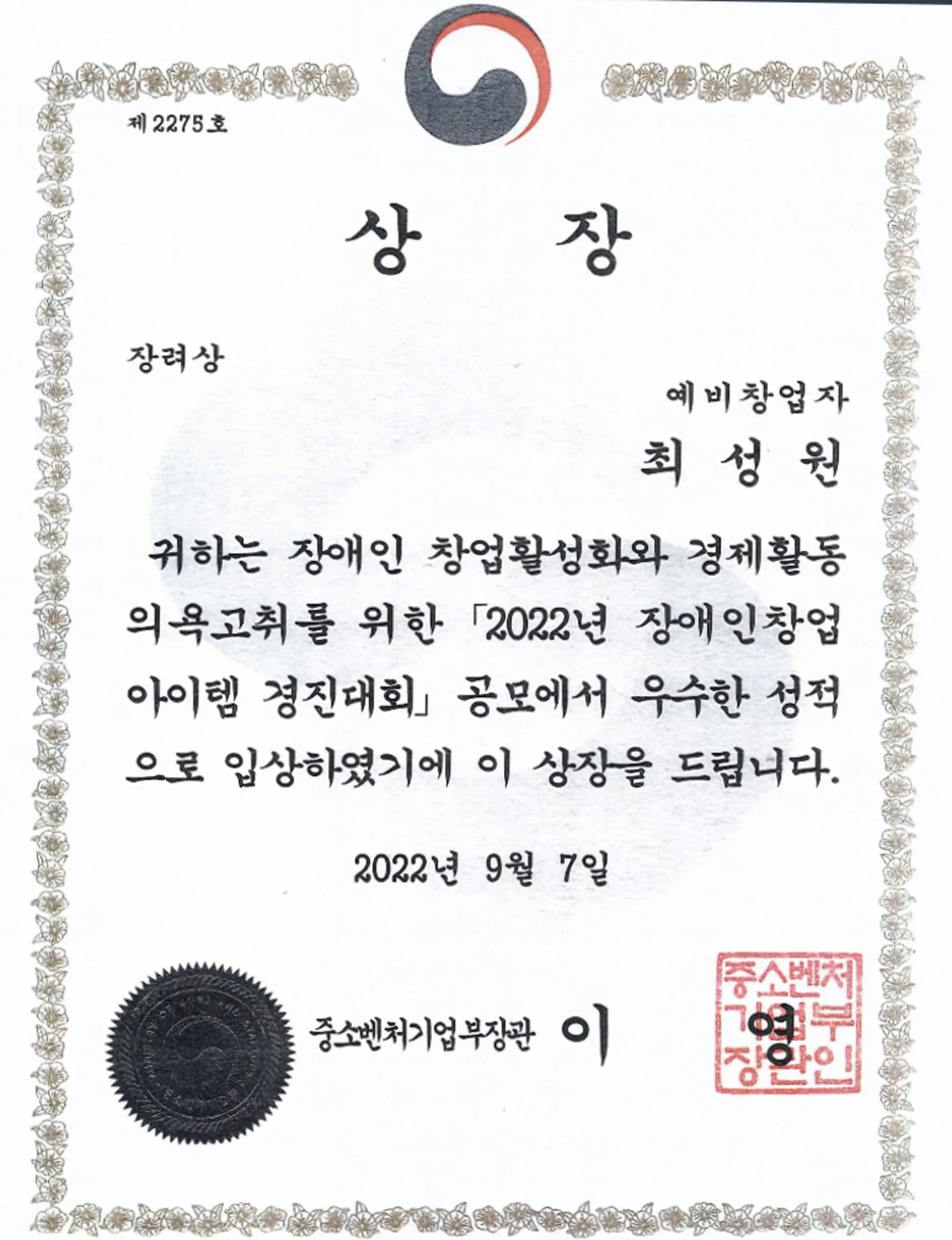 2022.09. 장애인창업아이템 경진대회 중소벤처기업부 장관상 수상