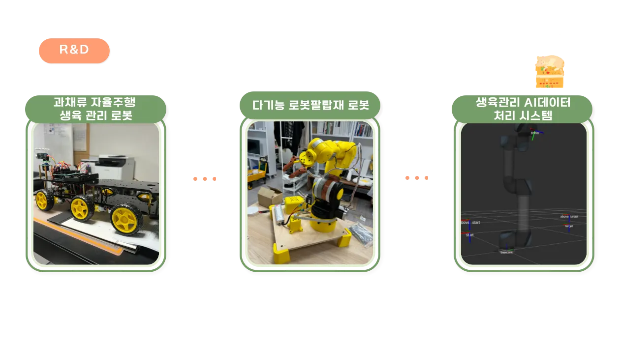 딸기를 포함한 과채류 과실 및 줄기 종합 분석을 위한 3D맵핑/라이다센서 활용 머신 러닝과 모종 손질, 수분, 수확용 수직형 스마트팜 특화 그리퍼 개발로 재배 설비 전 자동화 전환을 이루어내기 위한 노력을 하고 있습니다.